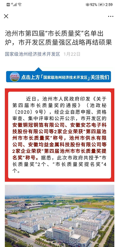 池州市市長質量獎的評選旨在通過樹立質量先進典范,提升我市質量競爭力和經濟綜合實力,每兩年評選一次,每屆獲“市長質量獎”的企業(yè)不超過兩家,獲“市長質量獎提名獎”的企業(yè)不超過5家。本屆池州市市長質量獎是池州市高質量發(fā)展戰(zhàn)略實施以來的第四屆,共選出2個市長質量獎和4家提名獎企業(yè)。面對榮譽,池州供水公司負責人強調,殊榮是對我們過去工作的肯定,更是對我們未來目標的鞭策,我們要不忘初心、牢記使命,堅定不移走高質量發(fā)展之路,堅定不移以卓越績效為引領,全面深化公司高品質管理與運營,為建設“三優(yōu)池州”做出更大更優(yōu)的貢獻。