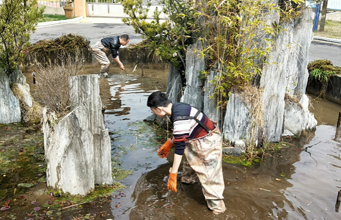 在廠領(lǐng)導(dǎo)的帶領(lǐng)下,大家利用工作間隙時間,發(fā)揚不怕累不怕臟、無私奉獻的優(yōu)良作風(fēng),對員工值班室,辦公樓、廠區(qū)前院觀景池、廠區(qū)各條巷道等處進行了徹底打掃。大家積極踴躍,有的拿著掃帚清掃衛(wèi)生死角,有的用水槍沖洗道路,有的清理綠化區(qū)域里的雜物,個個勁頭十足。廠里年輕的小伙子還主動穿上雨褲,跳進冰冷的觀景池中,對泉池內(nèi)的水草、藻類及其他污物進行清理。
