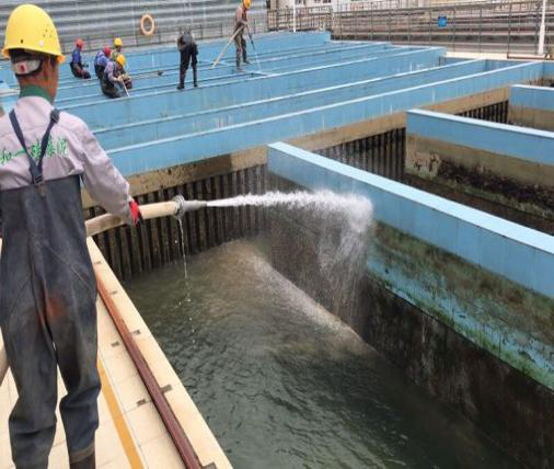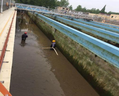 23日早晨,清洗人員全部準備就緒,在做好安全防護措施后,先是將平流池鋼槽及不銹鋼折板絮凝池池壁進行清洗,隨后排空平流池,在確定水位足夠時,清洗人員穿好雨衣雨褲,用爬梯下到池底,將連接好的龍帶進行高壓噴射清洗。公司分管領(lǐng)導和水廠負責人全程現(xiàn)場指導清洗,提醒清洗人員注意安全。經(jīng)過8個小時多的奮戰(zhàn),池底的淤泥終于在下午5:00清洗干凈,清洗人員安全有序的從池底撤出來,收拾好沖洗工具,擺放整齊,順利完成了本次平流池的清洗工作。