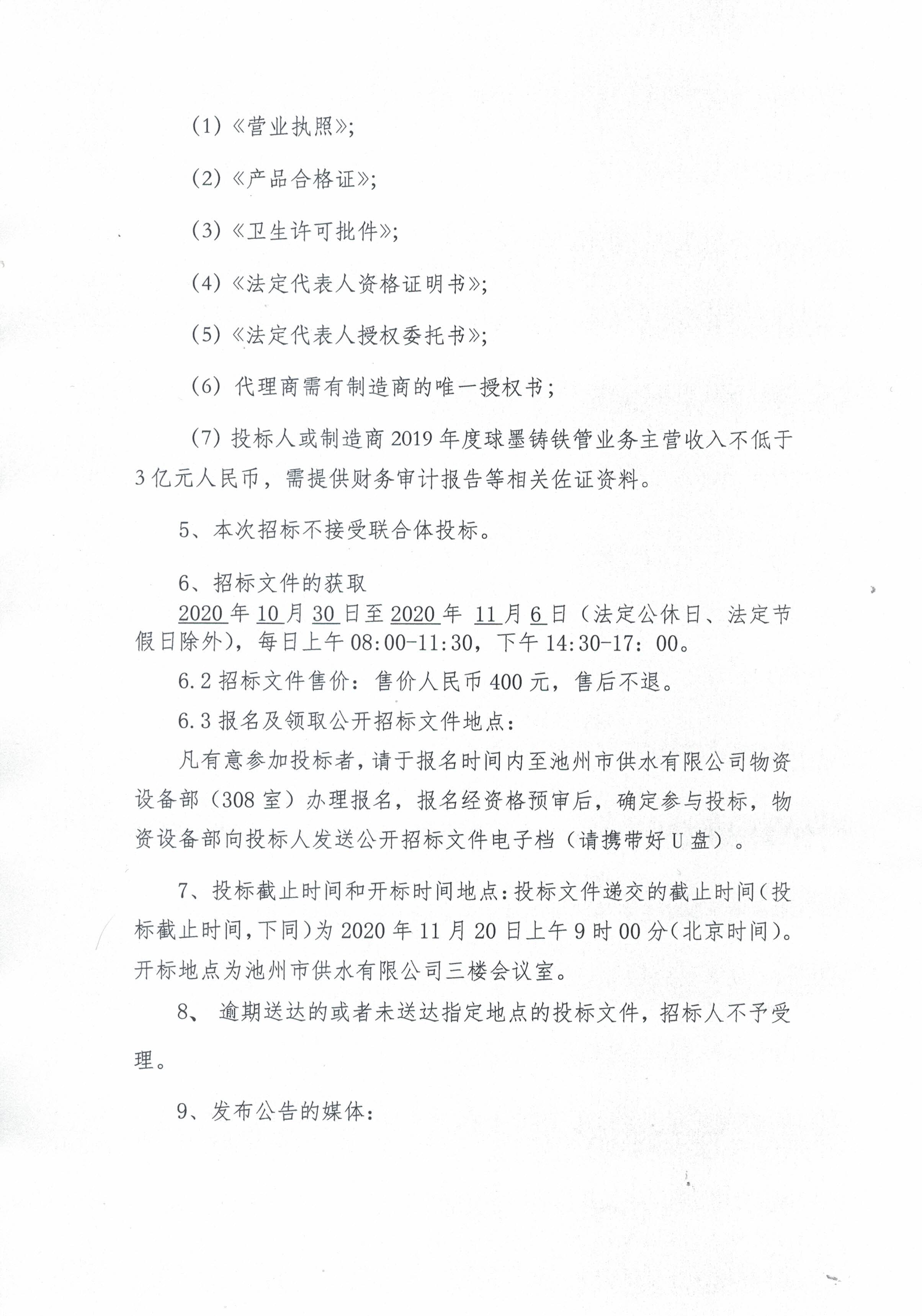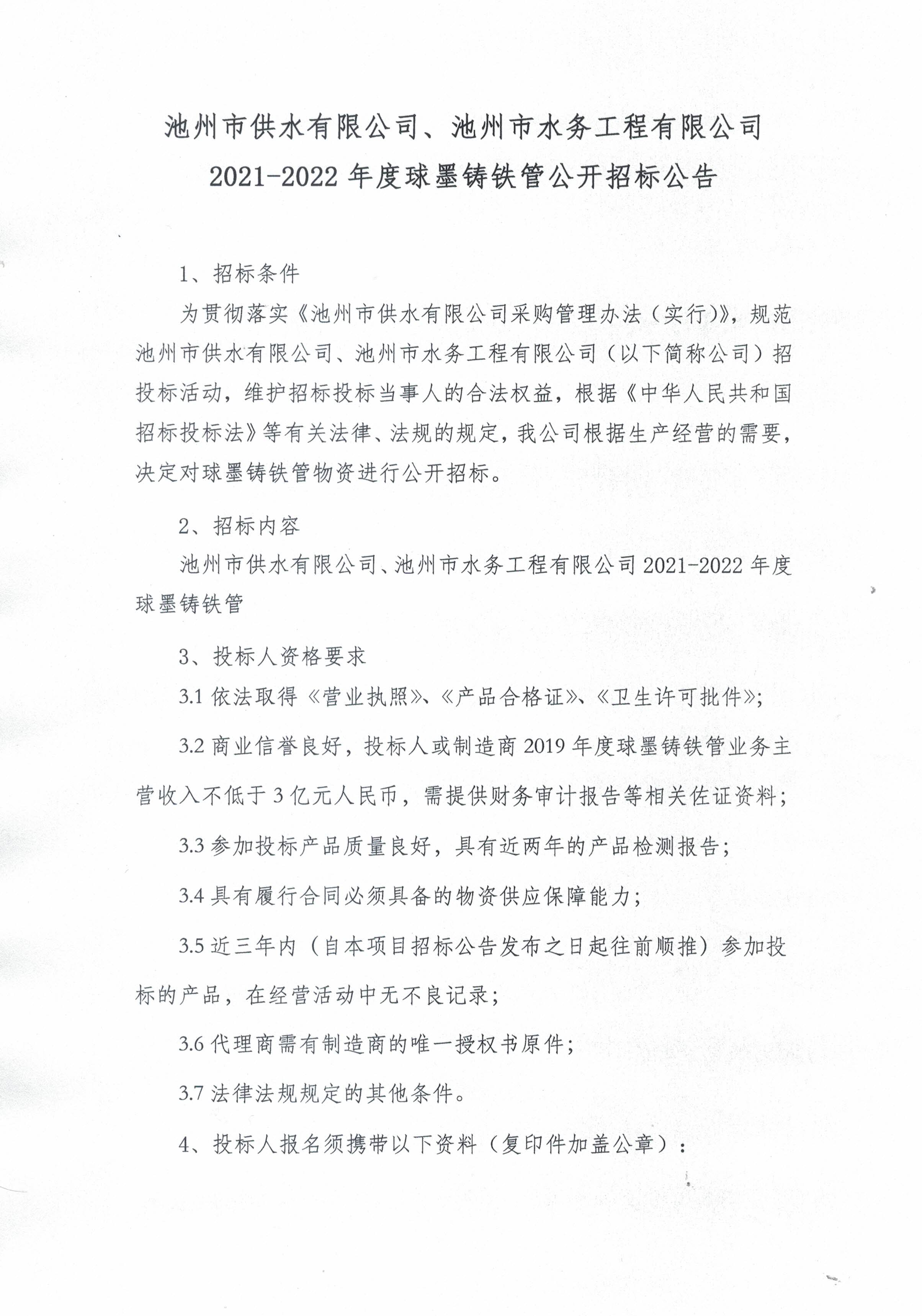 | 池州市供水有限公司、池州市水務(wù)工程有限公司2021-2022年度球墨鑄鐵管公開招標(biāo)公告 | |
