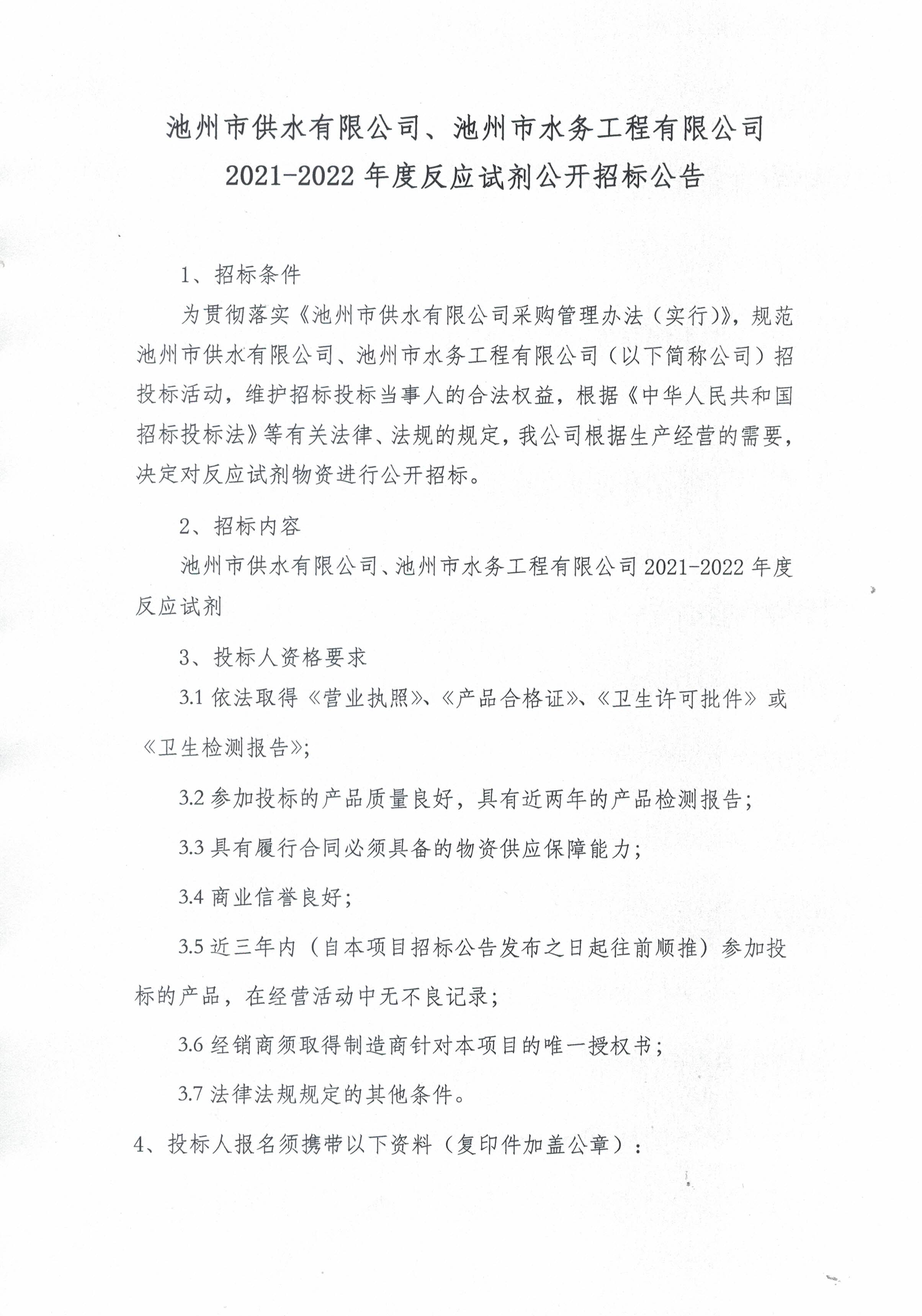 | 池州市供水有限公司、池州市水務工程有限公司2021-2022年度反應試劑公開招標公告 | |