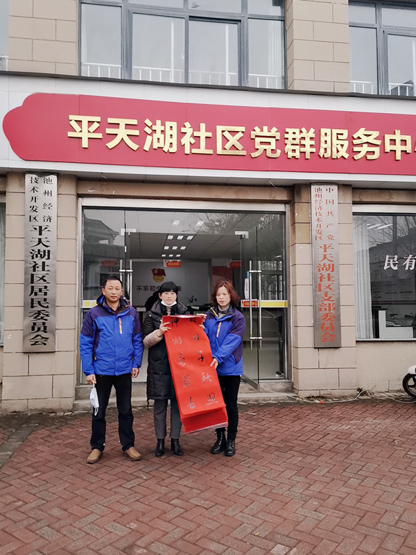 平天湖社區(qū)是供水公司多年文明創(chuàng)建共建單位,送春聯(lián)的第一站,施潔主席一行就選擇了和諧共建、關(guān)系融洽的平天湖社區(qū)。胡桂珍書記她們早早地在門口迎接,熱情洋溢地表達(dá)對公司的感謝和共建愉悅之情。“供水公司太有心了,每年都請人手寫對聯(lián),送到我們社區(qū),社區(qū)居民有福了,大家都很喜歡這手寫對聯(lián),感謝供水公司愛心!,胡書記如是說。