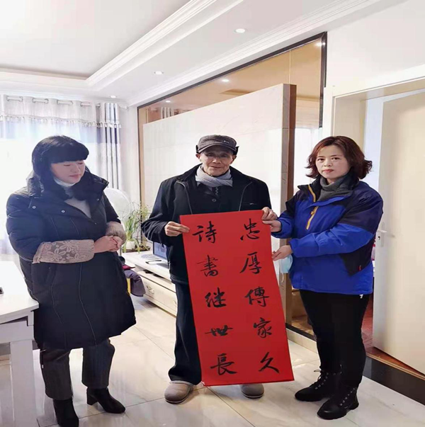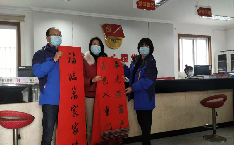 送春聯(lián)第二站,我們來到了駐地公司所在社區(qū)東湖路社區(qū),社區(qū)方主任高興地說“你們每年都這么有心,而且送的時間也早,每年這個時候來社區(qū)辦事的人最多,剛好隨便帶一副手寫對聯(lián),我們社區(qū)都不需要宣傳,就很快分發(fā)完了。替他們感謝供水公司,更代表社區(qū)感謝供水公司,每年為我們社區(qū)共建獻(xiàn)計(jì)獻(xiàn)策、親力親為。”