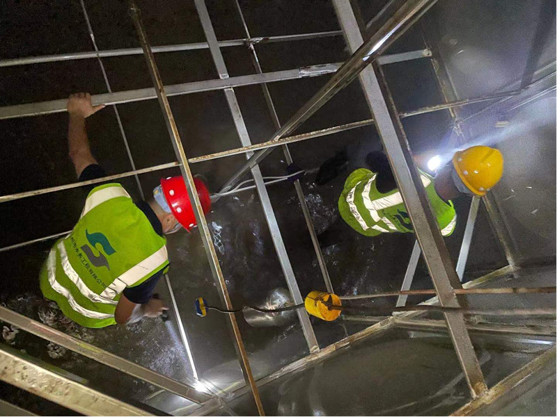 G318墩上收費(fèi)站的泵房已有較長(zhǎng)時(shí)間未進(jìn)行專業(yè)清洗消毒,泵房不銹鋼水箱體積較大。為保證有限空間作業(yè)安全,黨員志愿者們通過對(duì)水箱內(nèi)部通風(fēng)換氣等方式,在保障水箱內(nèi)部安全的前提下,用水槍對(duì)水箱內(nèi)壁進(jìn)行反復(fù)清洗、排放、消毒。在志愿者們的努力下,徹底將不銹鋼水箱清洗干凈,并將清洗情況詳細(xì)告知收費(fèi)站管理人員,指導(dǎo)他們泵房日常維護(hù)保養(yǎng)和清洗消毒方面的知識(shí),確保日常飲用水安全。