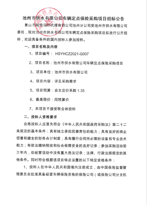 | 池州市供水有限公司車輛定點保險采購項目招標公告 | |