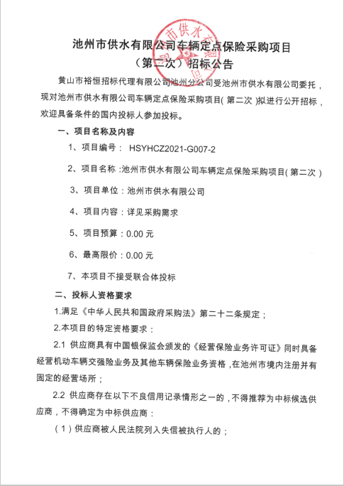 | 池州市供水有限公司車輛定點(diǎn)保險(xiǎn)采購項(xiàng)目(第二次)招標(biāo)公告次) | |
