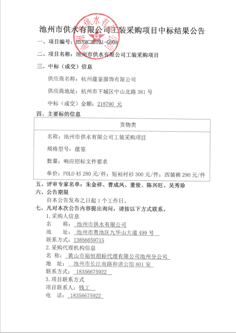 | 池州市供水有限公司工裝采購項(xiàng)目中標(biāo)結(jié)果公告 | |