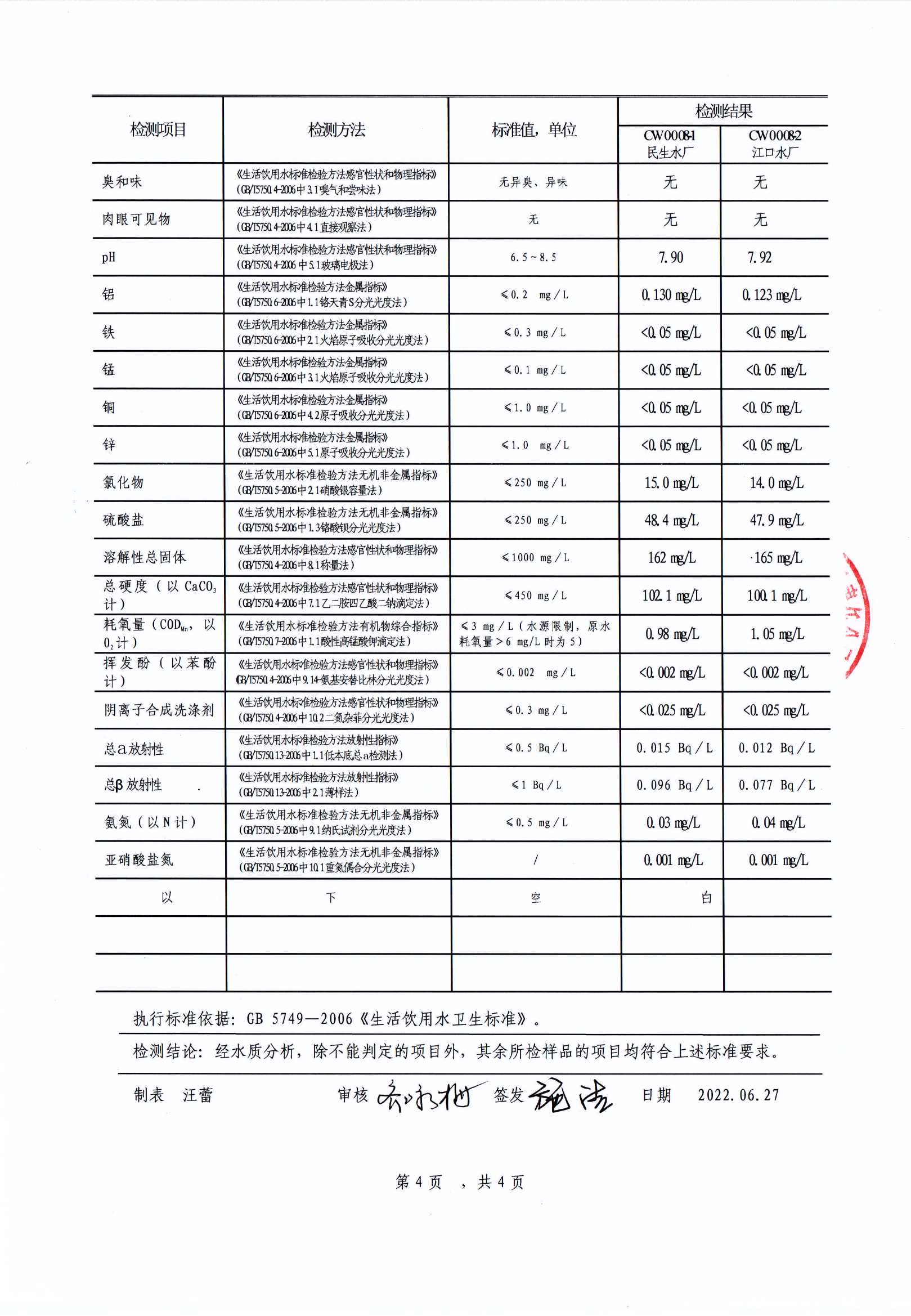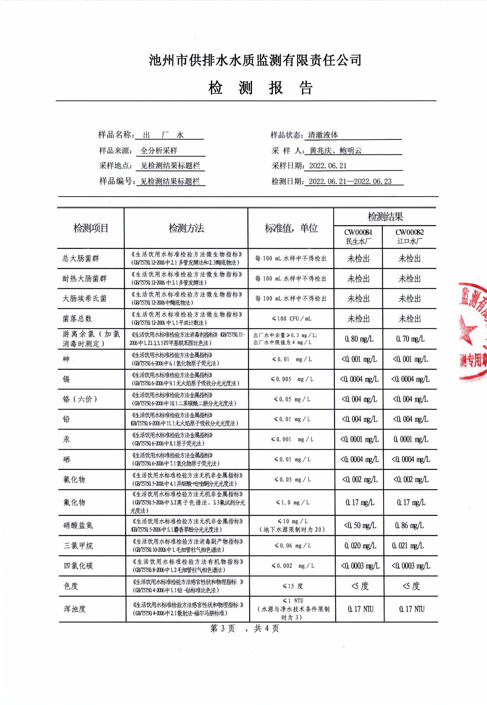 | 池州市供水有限公司出廠水(全分析)檢測報(bào)告(2022.07.14) | |