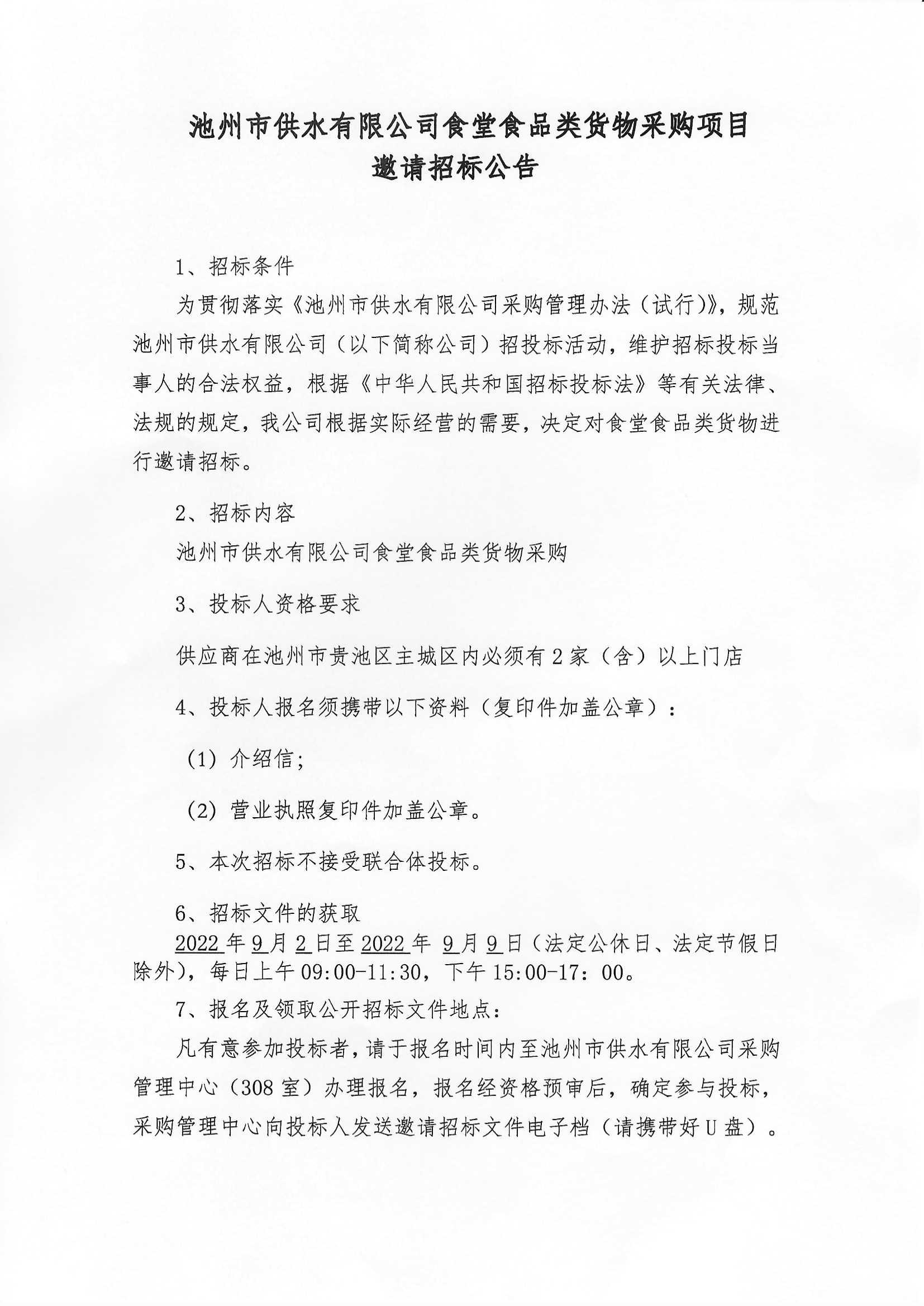 | 池州供水公司食堂食品類貨物采購(gòu)項(xiàng)目邀請(qǐng)招標(biāo)公告 | |