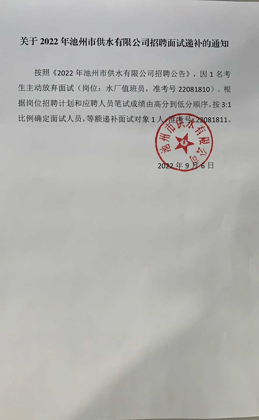 | 關(guān)于2022年池州市供水有限公司招聘面試遞補的通知 | |