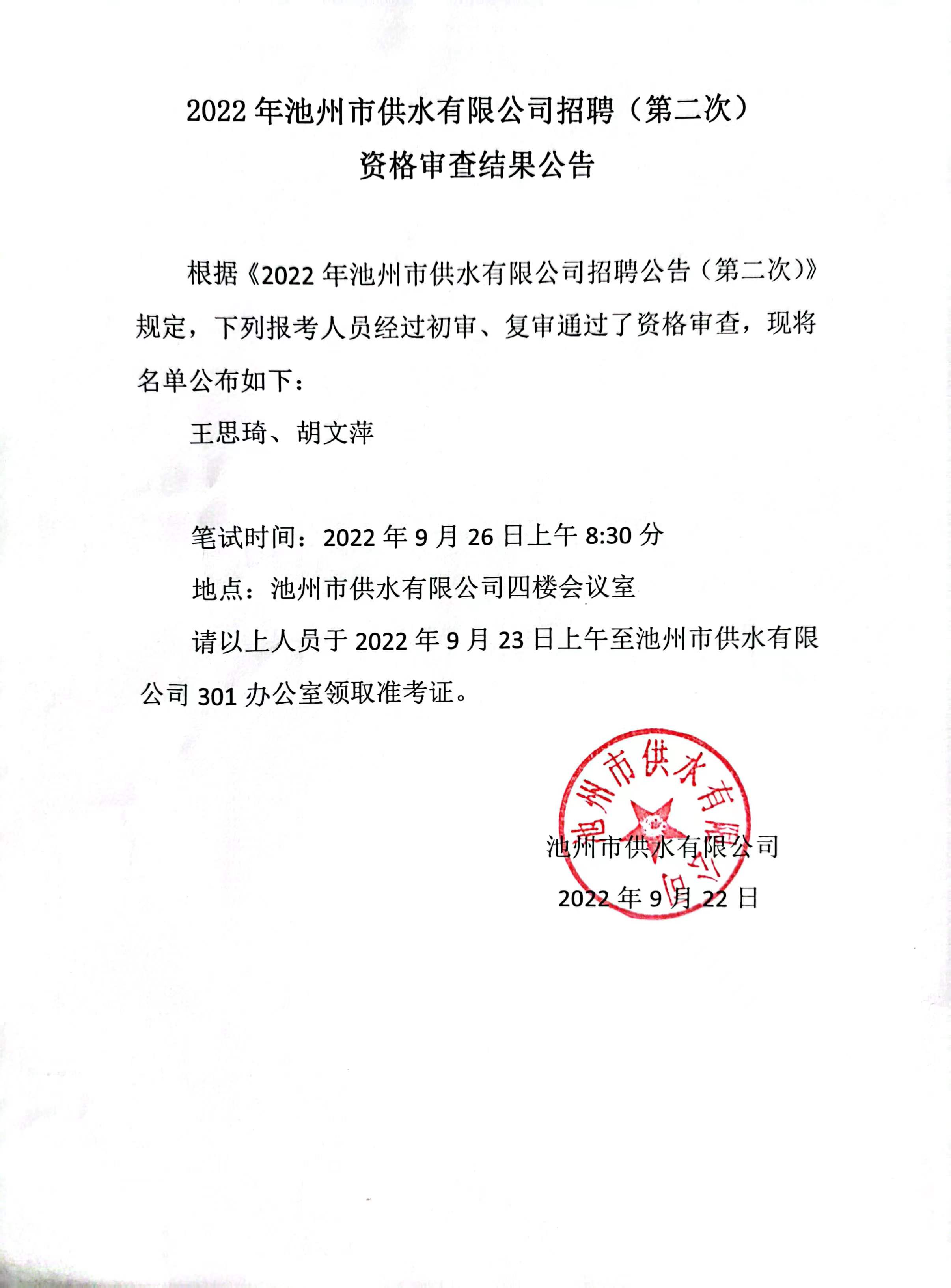 | 2022年池州市供水有限公司招聘公告(第二次)資格審查結果公告 | |