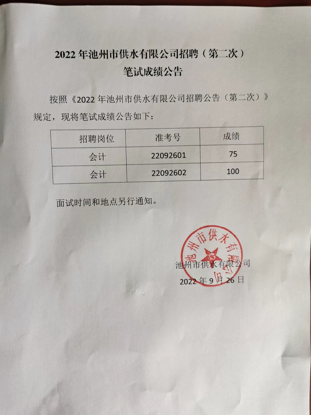| 2022年池州市供水有限公司招聘(第二次)筆試成績(jī)公示 | |