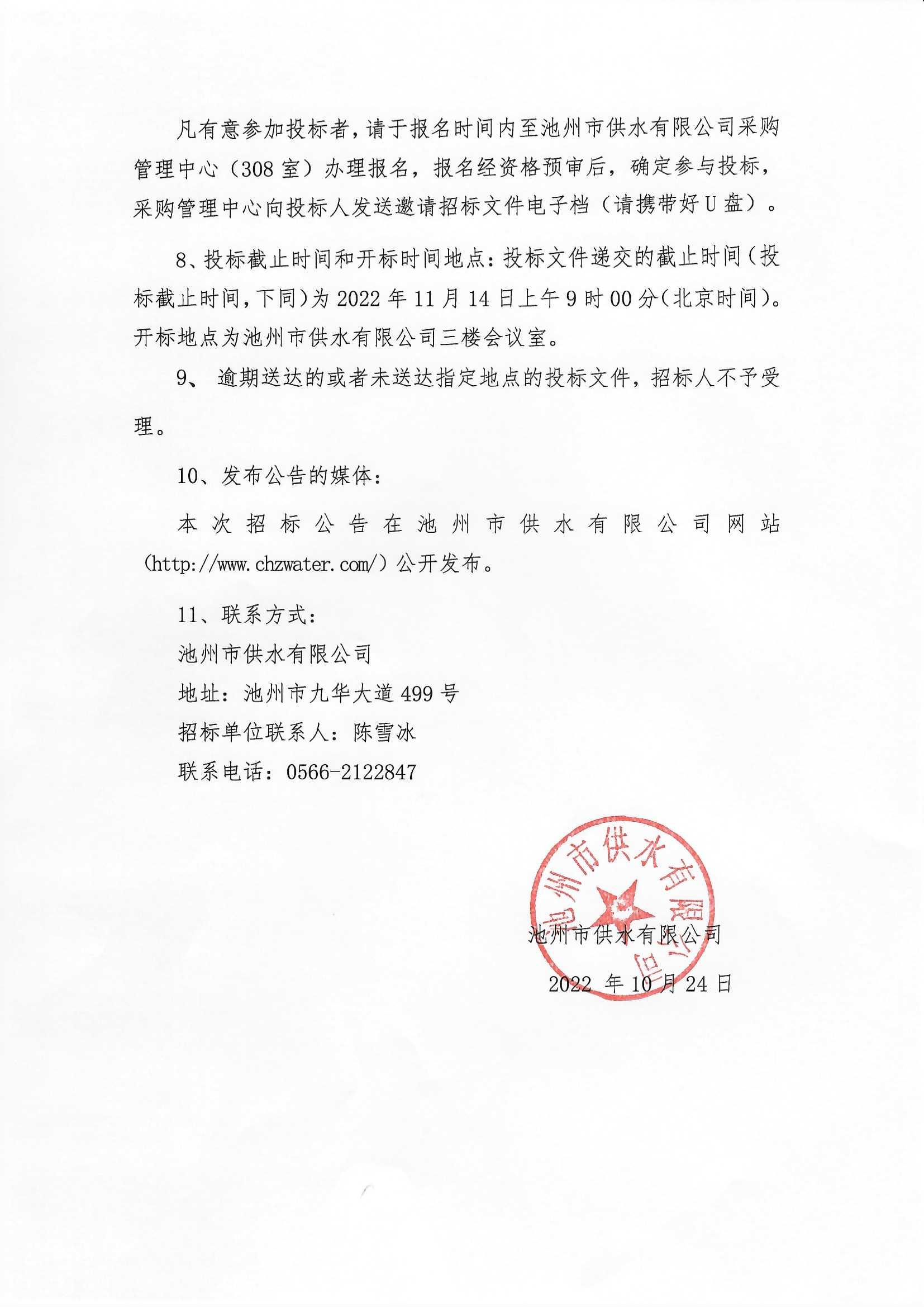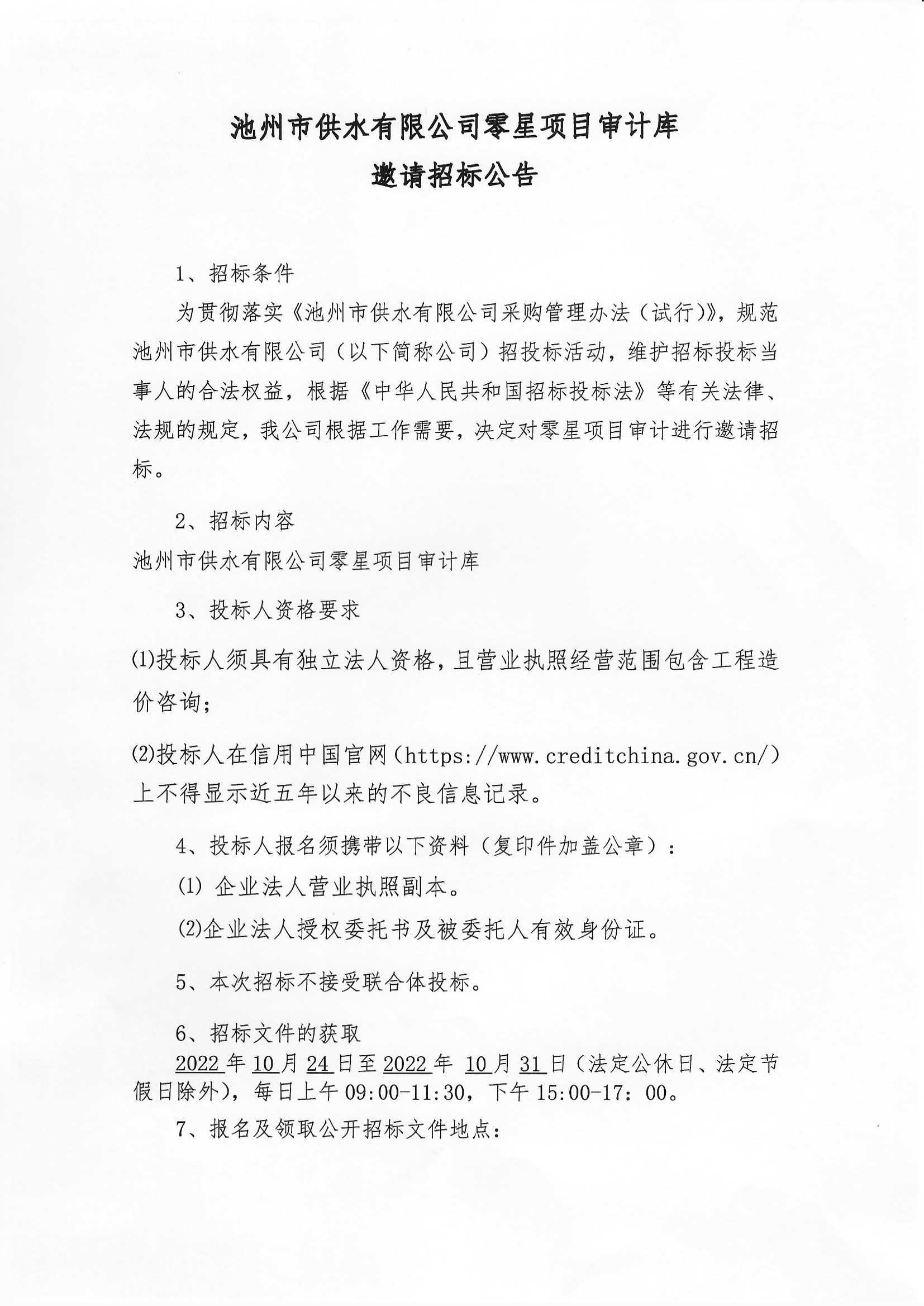 | 池州市供水有限公司零星項目審計庫邀請招標公告 | |