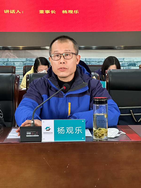 會議第三項(xiàng),楊觀樂董事長作題為《砥礪深耕 奮楫篤行 奮力開創(chuàng)池州供水高質(zhì)量發(fā)展新篇章》的主旨講話。他指出,2022年,我們面對疫情防控、內(nèi)部經(jīng)營指標(biāo)和水壓水質(zhì)輿情等多重壓力,化危為機(jī)、迎難而上,緊緊依靠廣大干部職工,真抓實(shí)干、勤勉工作,在精細(xì)管理、業(yè)務(wù)拓展、民生保障、設(shè)施建設(shè)上再獲新功;這一年,我們堅持高舉旗幟、堅定推進(jìn)融合發(fā)展,黨建引領(lǐng)走深走實(shí);堅持系統(tǒng)思維、堅定深化內(nèi)部治理,企業(yè)發(fā)展活力激發(fā)迸發(fā);堅持守正創(chuàng)新、堅定推進(jìn)開源節(jié)流,企業(yè)經(jīng)營提質(zhì)增效;堅持民生至上、堅定推進(jìn)供水保障,廣大用戶有得有感。他強(qiáng)調(diào),2023年,我們一要堅定不移聚焦黨建創(chuàng)新,打造黨建與經(jīng)營融合的新典范;二要堅定不移聚焦提質(zhì)增效,打造供水發(fā)展的新樣板;三要堅定不移聚焦主業(yè)主責(zé),打造民生保障的新范例;四要堅定不移聚焦團(tuán)隊建設(shè),打造人才建設(shè)的新高地;五要堅定不移聚焦文化引領(lǐng),打造深水品牌的新名片。他號召大家,高舉旗幟、凝心聚力、“致廣大而盡精微”、腳踏實(shí)地、迎難而上、開拓進(jìn)取,跑出“奔池速度”,在新征程上書寫新的美麗供水篇章,為新階段“三優(yōu)池州”提供強(qiáng)有力的供水支撐,為開創(chuàng)中國式現(xiàn)代化貢獻(xiàn)池水力量。
