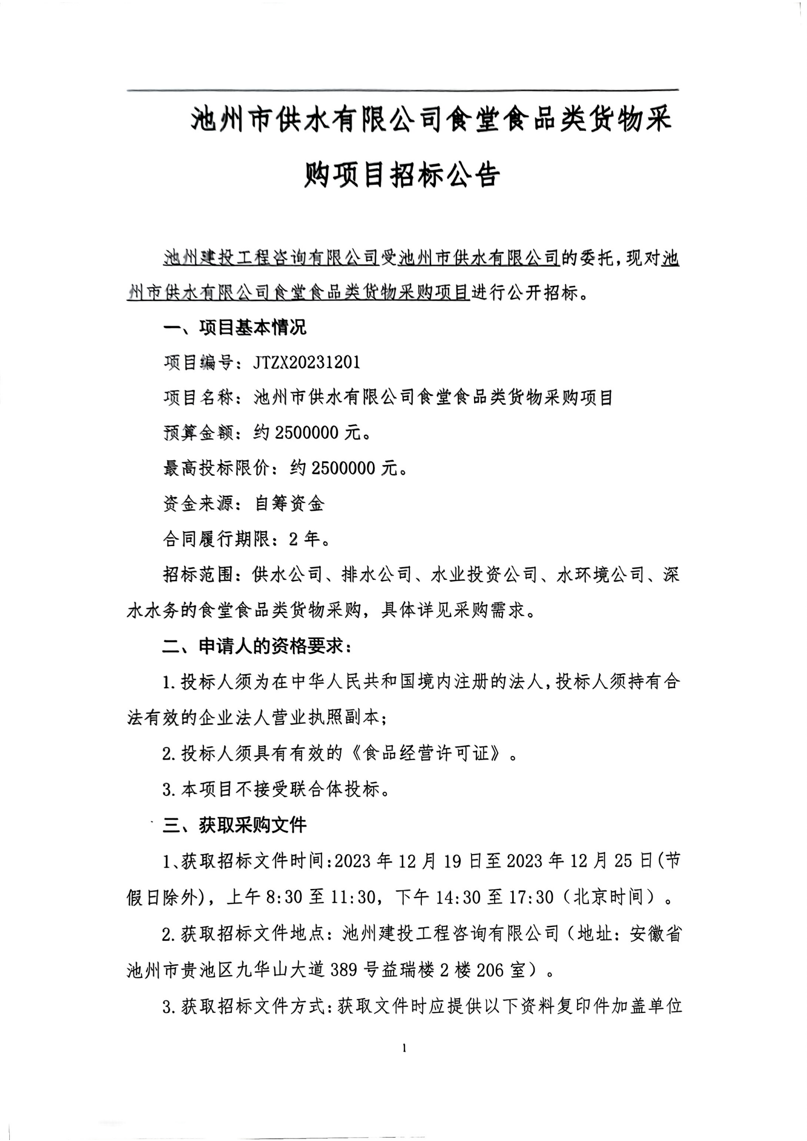 | 池州市供水有限公司食堂食品類貨物采購項(xiàng)目招標(biāo)公告 | |