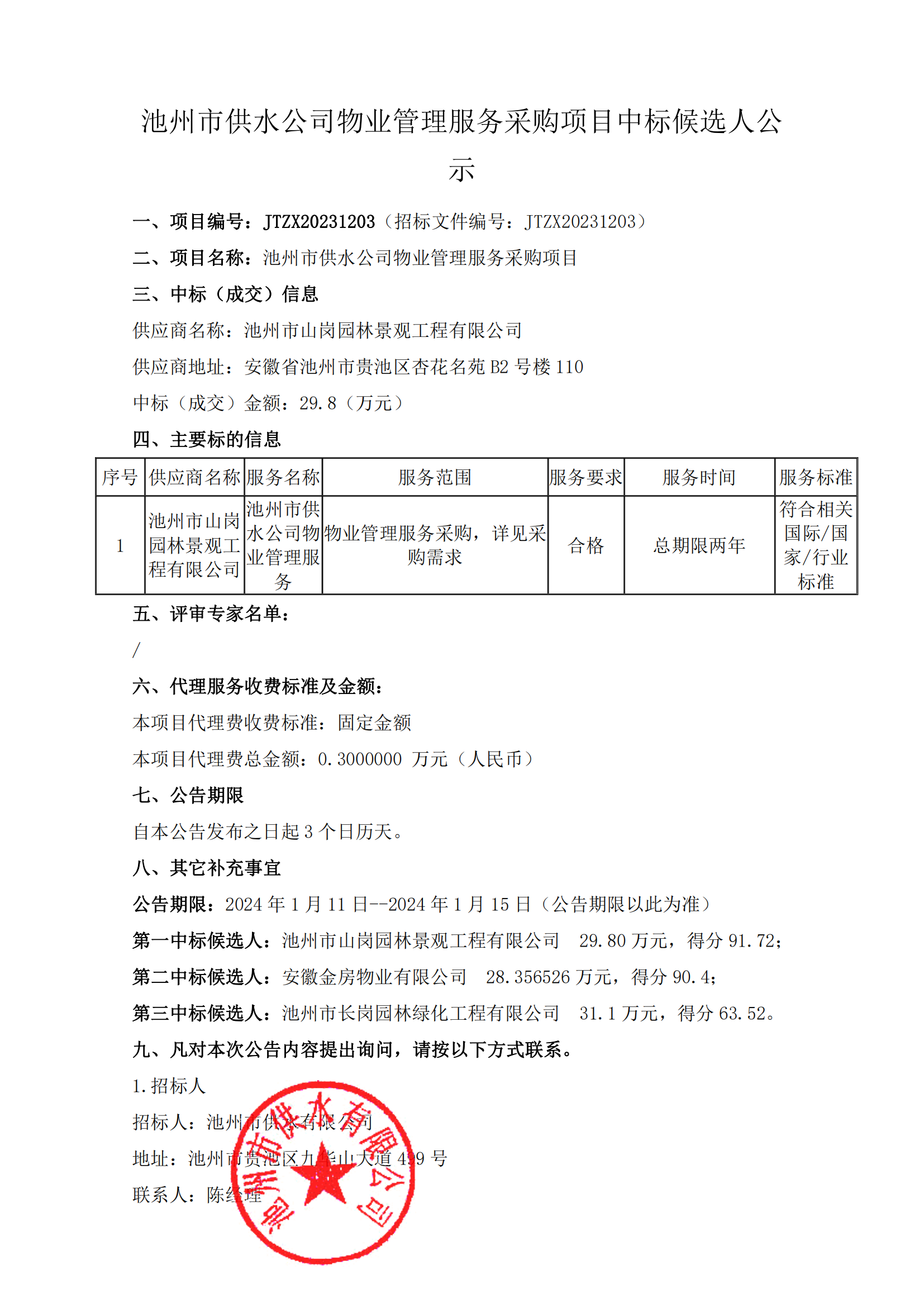 | 池州市供水公司物業(yè)管理服務(wù)采購項(xiàng)目中標(biāo)候選人公示 | |