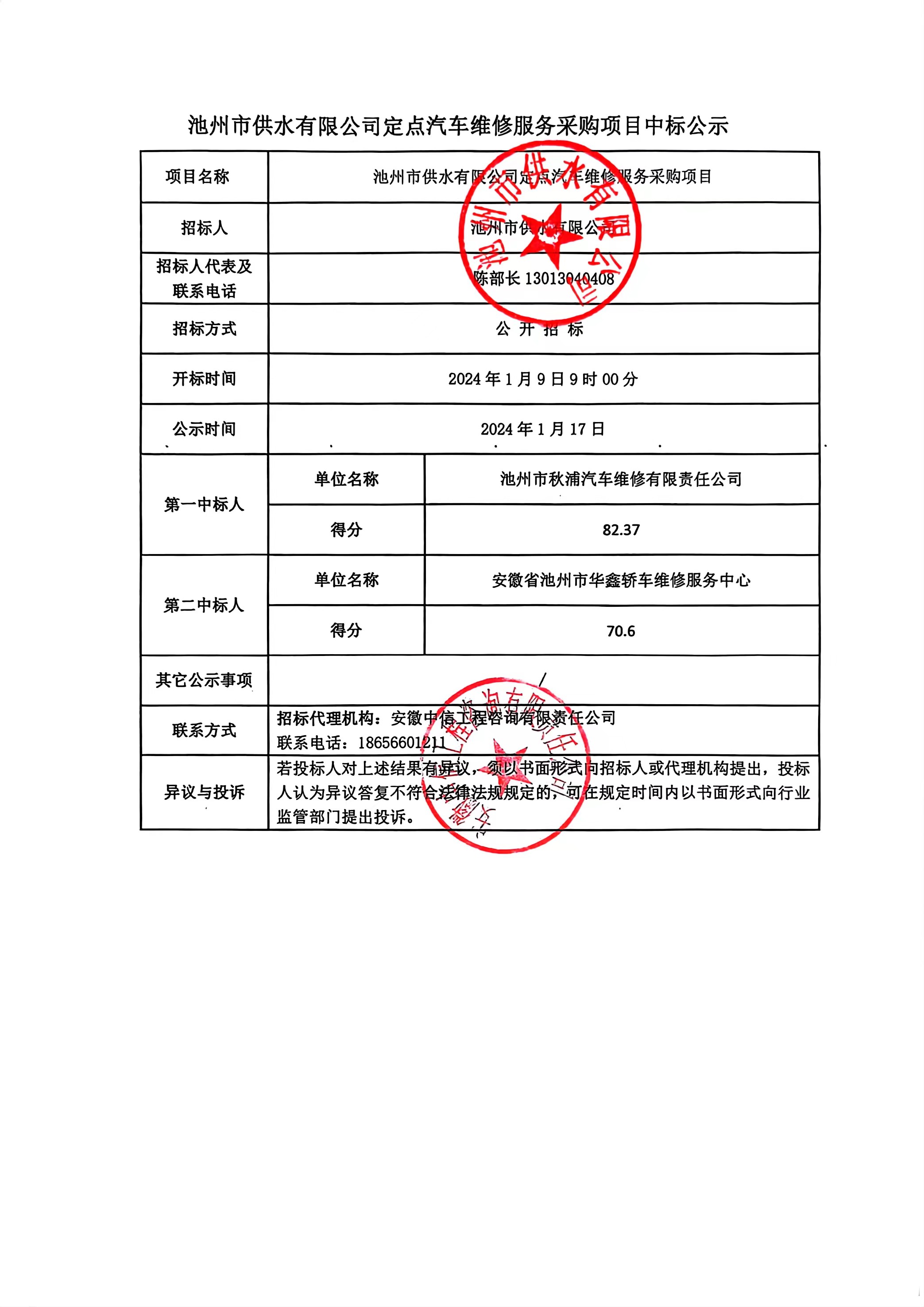 | 池州市供水有限公司定點(diǎn)汽車(chē)維修服務(wù)采購(gòu)項(xiàng)目中標(biāo)公示 | |