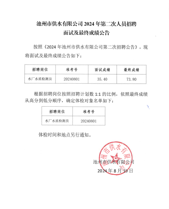 | 池州市供水有限公司2024年第二次招聘面試及最終成績(jī)公告 | |