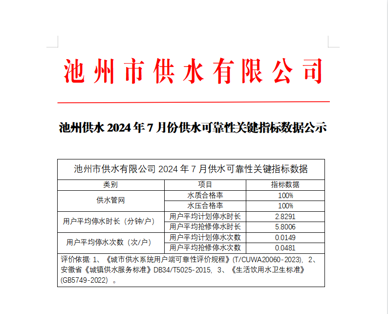 | 池州供水2024年7月份供水可靠性關(guān)鍵指標(biāo)數(shù)據(jù)公示 | |