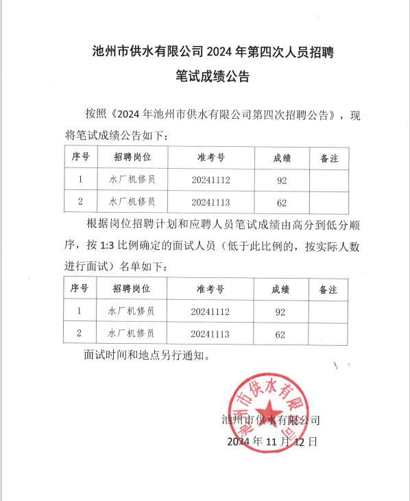 | 池州市供水有限公司人員2024年第四次人員招聘筆試成績公告 | |