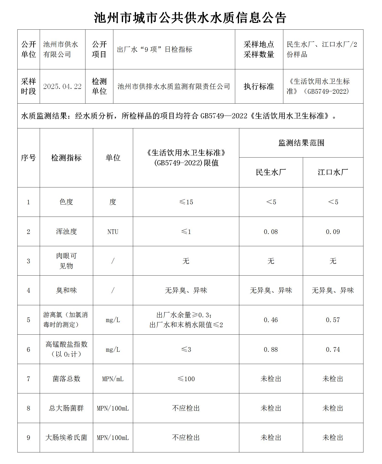 | 池州市城市公共供水水質(zhì)信息公告出廠水“9項(xiàng)”日檢指標(biāo)2025.04.22 | |