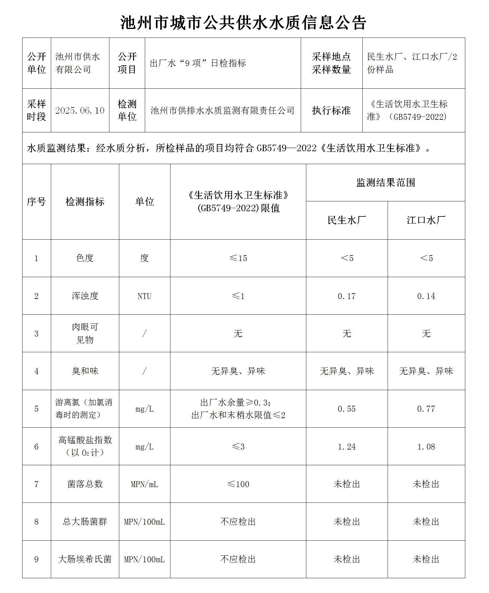 | 池州市城市公共供水水質信息公告出廠水“9項 ”日檢指標2025.06.10 | |
