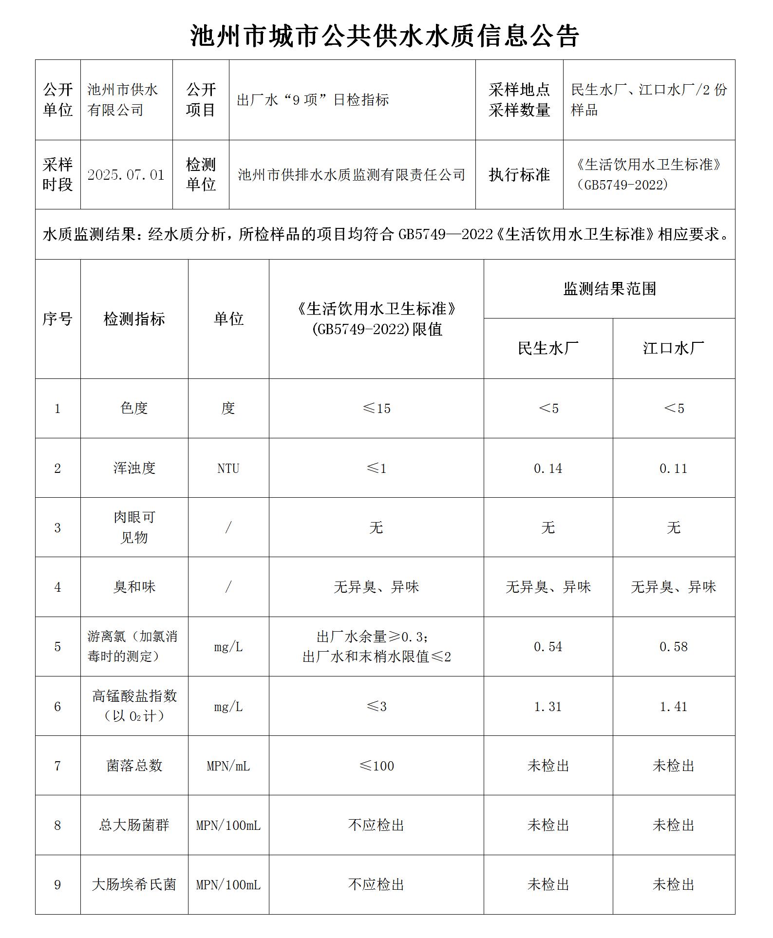 | 池州市城市公共供水水質(zhì)信息公告出廠水“9項(xiàng)”日檢指標(biāo)2025.07.01 | |