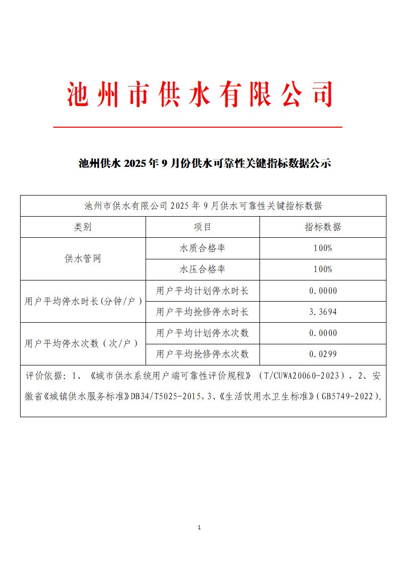 | 池州供水2025年9月份供水可靠性關(guān)鍵指標(biāo)數(shù)據(jù)公示 | |