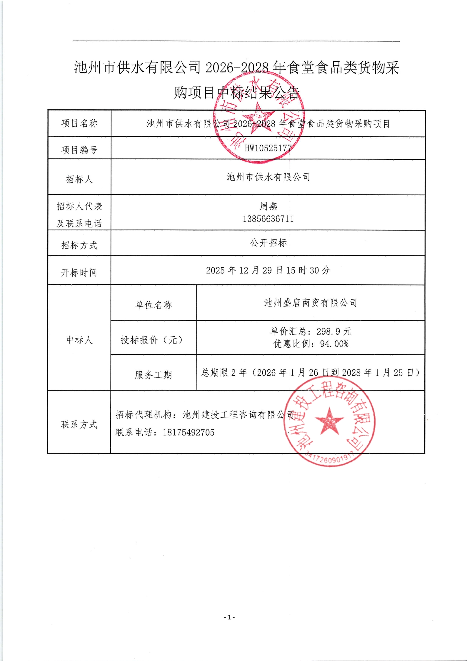 | 池州市供水有限公司2026-2028年食堂食品類貨物采購(gòu)項(xiàng)目中標(biāo)結(jié)果公告 | |