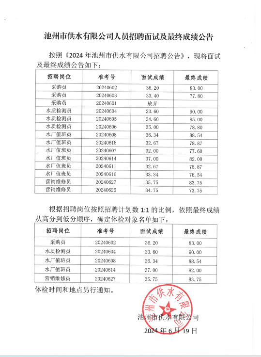 | 池州市供水有限公司人員招聘面試及最終成績公告 | |