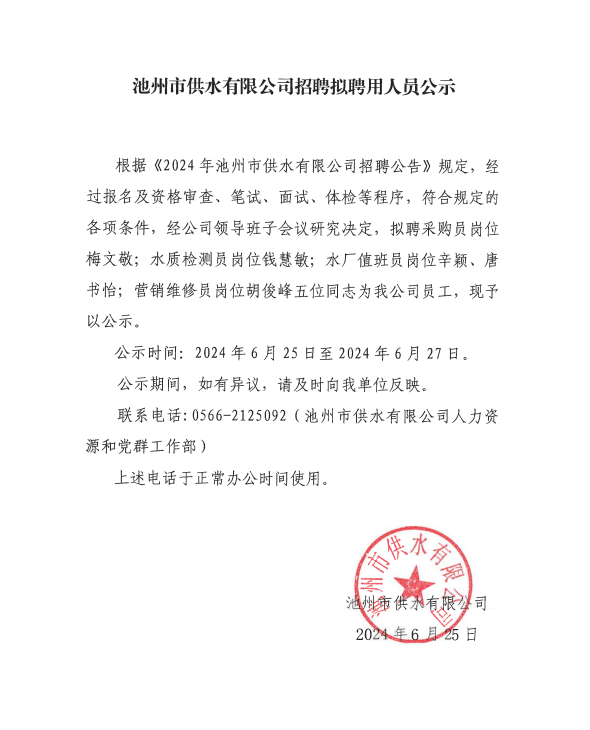 | 池州市供水有限公司招聘擬聘用人員公示 | |