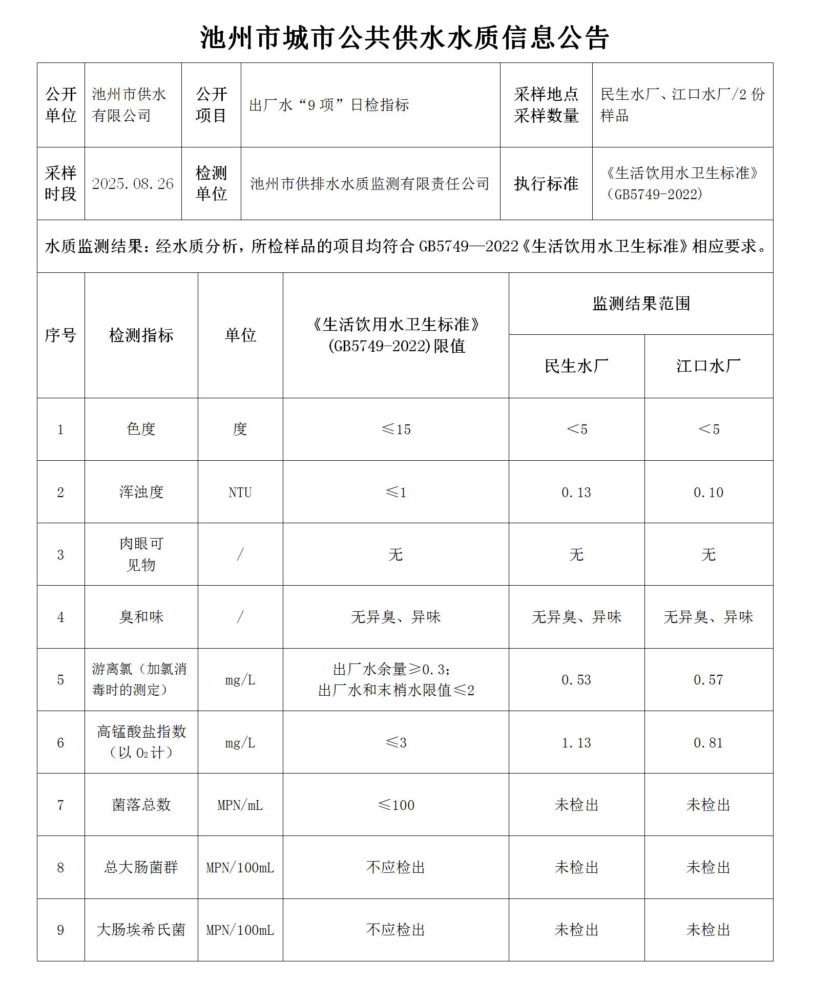 | 池州市城市公共供水水質(zhì)信息公告出廠水“9項”日檢指標2025.08.26 | |